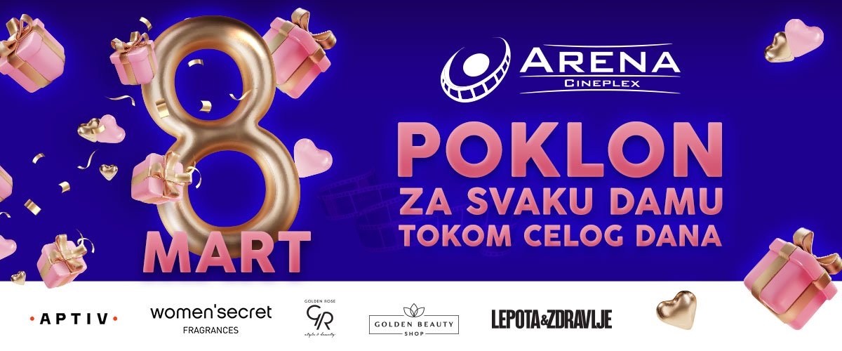 Svaka dama koja poseti bioskop 8. marta, dobiće na poklon dekorativni cvetni aranžman od bioskopa Arena Cineplex i kompanije Aptiv ili Golden Rose i Golden Beauty shop kozmetiku ili travel sprejeve od brenda Women Secret ili magazin Lepota i zdravlje ili poklon iznenađenja.