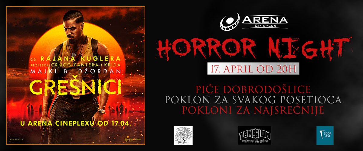 Na veliko platno bioskopa Arena Cineplex stiže novi horor/triler „Grešnici“ sa Majklom B. Džordanom u glavnoj ulozi. Tim povodom, organizovan je Horror Night događaj u četvrtak, 17. aprila u 20 časova, uz piće dobrodošlice i poklone za sve posetioce. Ulaznice u prodaji!