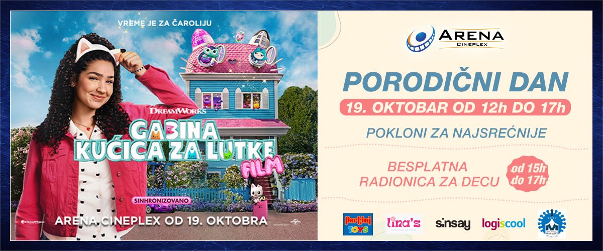 Planetarno popularna serija Gabina kućica za lutke stiže i na bioskopsko platno i donosi omiljene avanture u izmaštanom svetu devojčice Gabi i njenih drugara. Tim povodom, u nedelju 19. oktobra od 12 do 17 časova organizovan je Porodični dan u bioskopu Arena Cineplex uz poklone i besplatnu radionicu. Ulaznice su u prodaji!