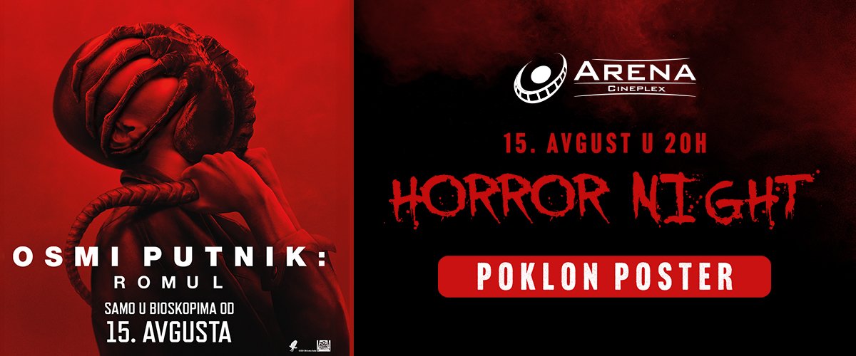 Strah se vraća u svemir u nastavku popularne franšize “Osmi putnik: Romul”, a tim povodom organizovan je Horror Night događaj u bioskopu Arena Cineplex u četvrtak, 15. avgusta od 20 časova. Ulaznice u prodaji!
